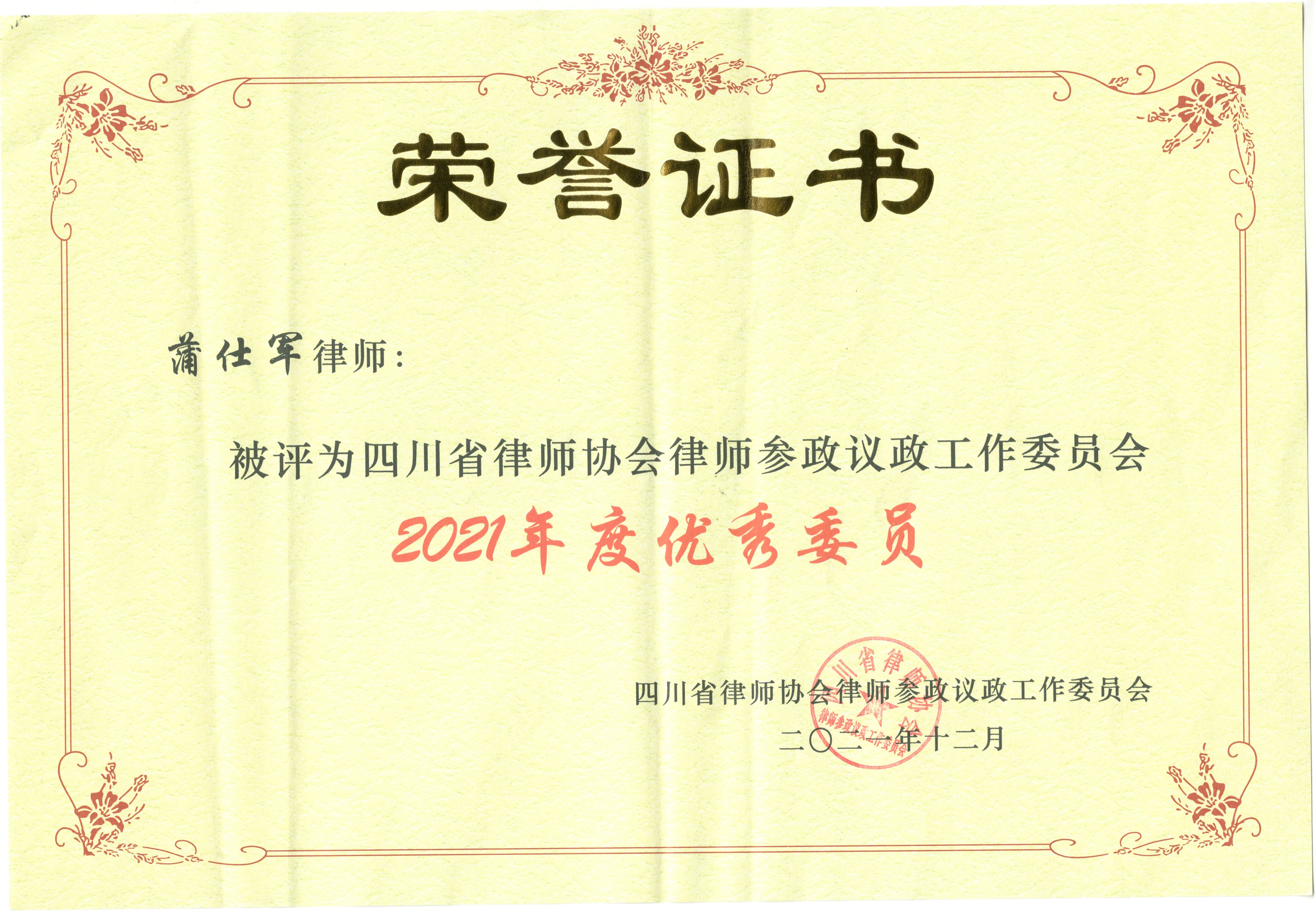 近日我所合伙人蒲仕军律师被四川省律师协会参政议政工委评为2021年优秀委员。