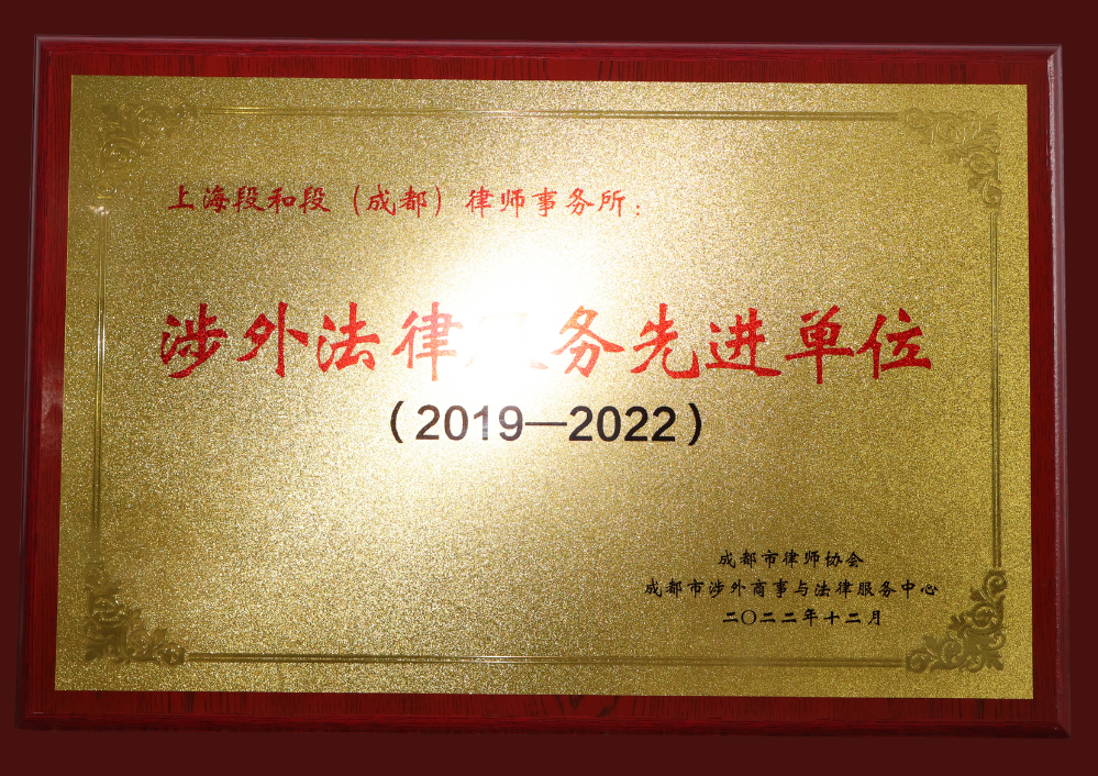 - 2022年12月成都市律师协会、成都市涉外商事与法律服务中心授予我所“2019-2022年度涉外法律服务先进单位”荣誉称号。