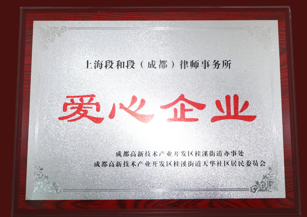 - 成都高新技术产业开发区桂溪街道办事处、成都高新技术开发区桂溪街道天华社区居民委员会赠予我所“爱心企业”牌匾。
