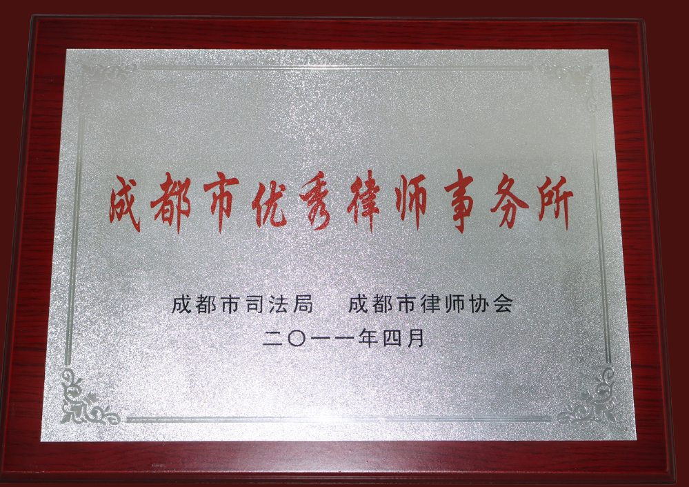 - 2011年4月成都市司法局、成都市律师协会授予我所“成都市优秀律师事务所”荣誉称号。