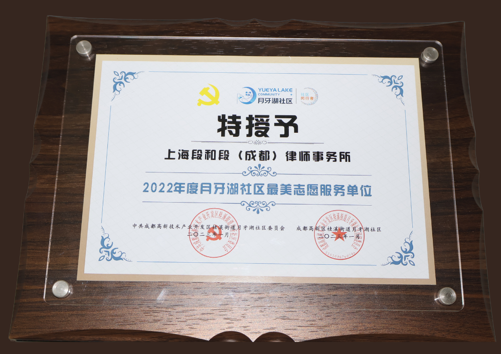 - 2022年12月成都市律师协会、成都市涉外商事与法律服务中心授予我所“2019-2022年度涉外法律服务先进单位”荣誉称号。