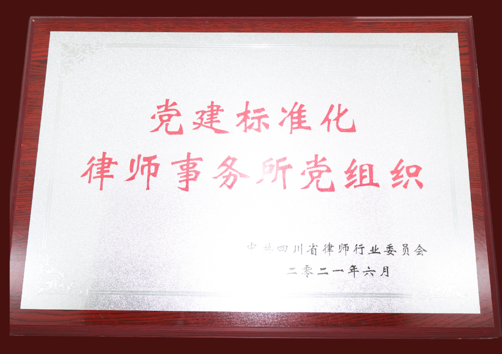 - 2021年6月中国四川省律师行业委员会授予我所“党建标准化律师事务所党组织”荣誉称号。