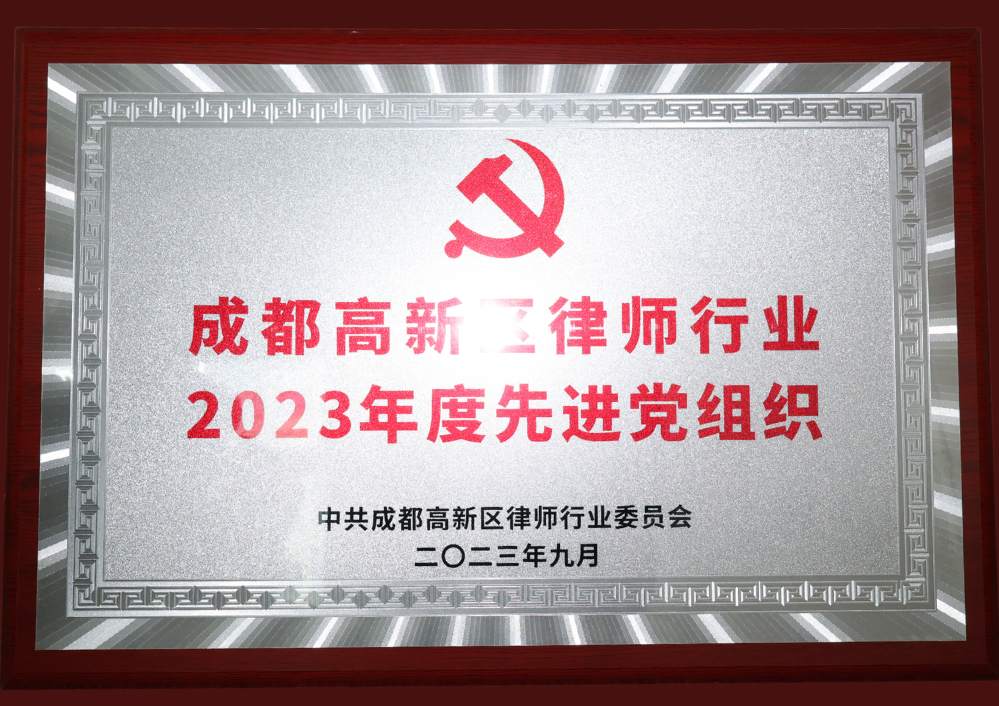 2023年9月中共成都高新区律师行业委员会授予我所“成都高新区律师行业2023年度先进党组织”荣誉称号。
