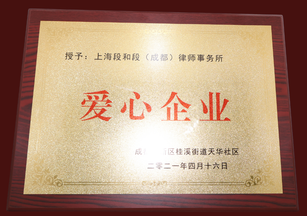 - 2021年4月成都市高新区桂溪街道天华社区赠予我所“爱心企业”牌匾。