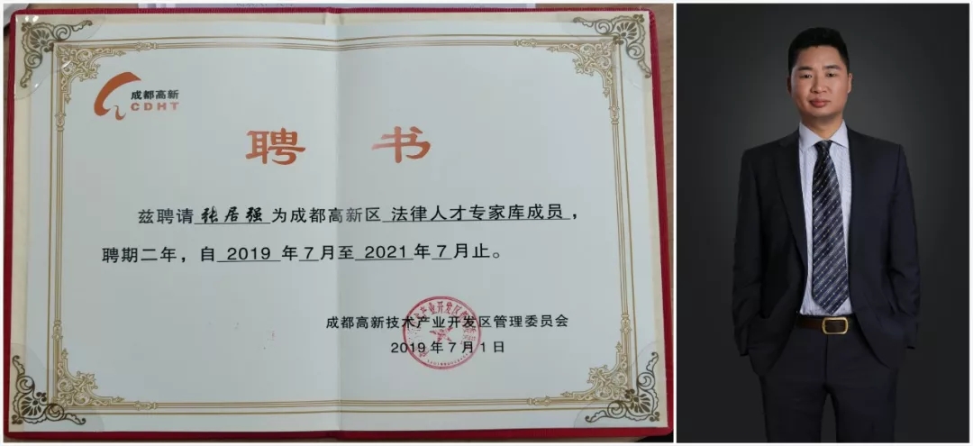 祝贺我所张居强律师当选成都高新区法律人才专家库成员