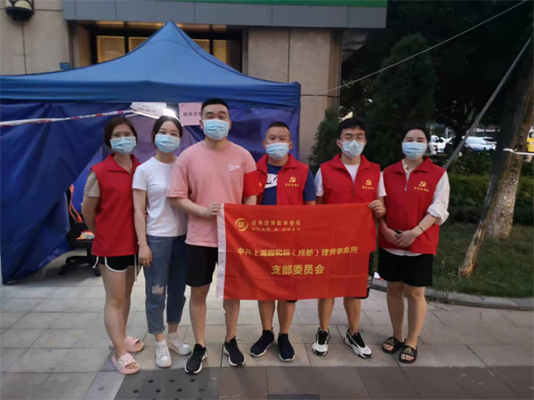 上海段和段(成都)律师事务所党支部在第一时间号召党员同志积极参与各社区核酸检测志愿者工作,7月31日,段和段党员李操、王玉红、曾莉、龙舟行等六名志愿者前往月牙湖社区,协助对核酸检测居民进行体温检测、现场引导、秩序维护等志愿者工作,与社区人员、医护人员并肩作战,共同抗疫。